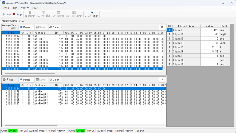 画面右側の シグナルモニター では、あらかじめ設定されたシグナル情報に基づき、メッセージを物理値へ変換してリアルタイムに表示します。フレームの変化だけでなく、シグナルの実値を直感的に把握することができます。