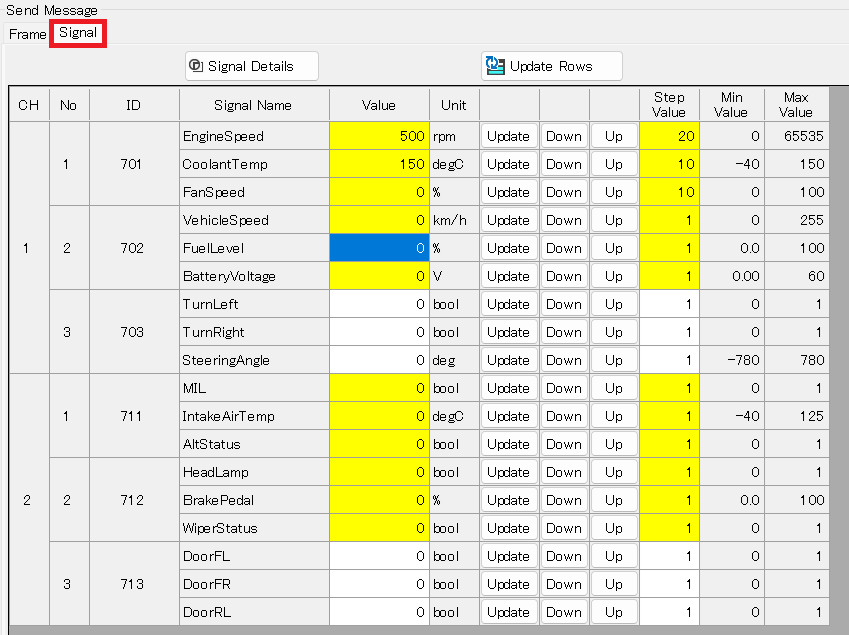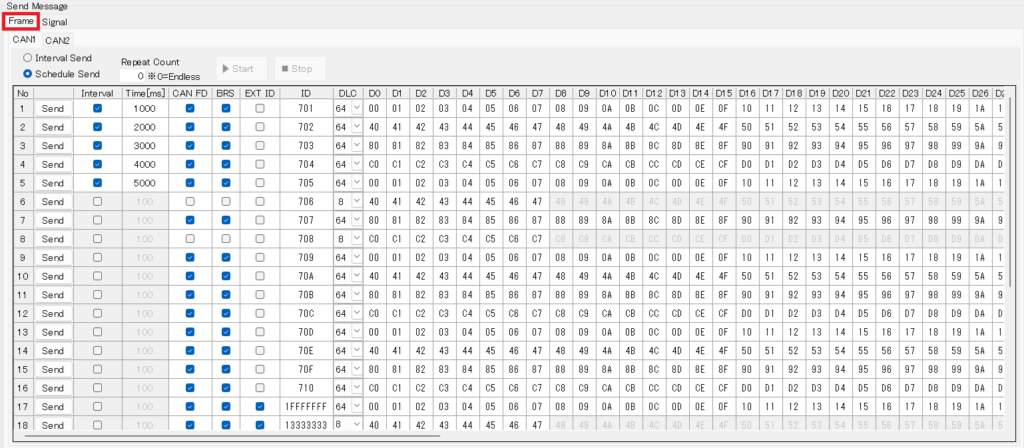 設定されたシグナル情報に基づき、定期送信・スケジュール送信中のフレームデータを物理値で変更できます。